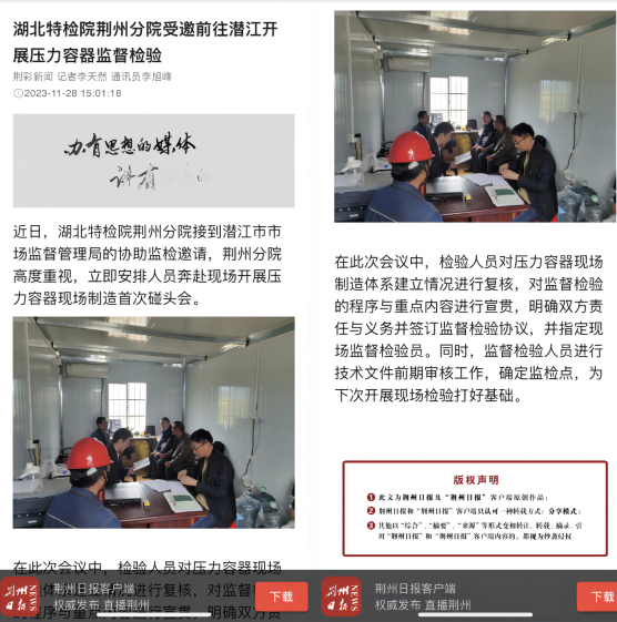 荊州(zhōu)日報(2023.趴在🔞废弃工厂等流浪狗上🌈12.11)厦门成同机电制造有限公司荊州分院(yuan)受邀前往潛江(jiāng)開展壓力容器(qi)監☂️督檢驗